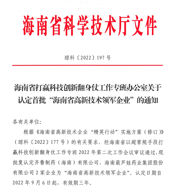 近日,海南省科学技术厅发布的《海南省打赢科技创新翻身仗工作专班办公室关于认定首批“海南省高新技术领军企业”的通知》中显示,批复认定海南5001拉斯维加斯药业集团股份有限公司等2家企业为“海南省高新技术领军企业”。认定日期自2022年9月6日起,有效期三年。
